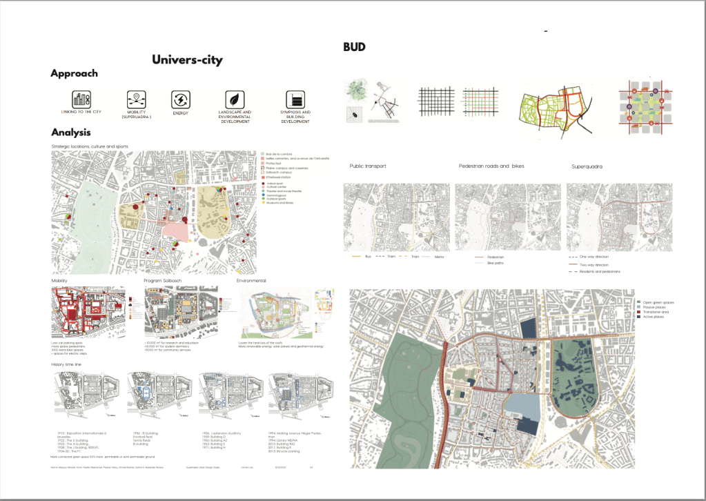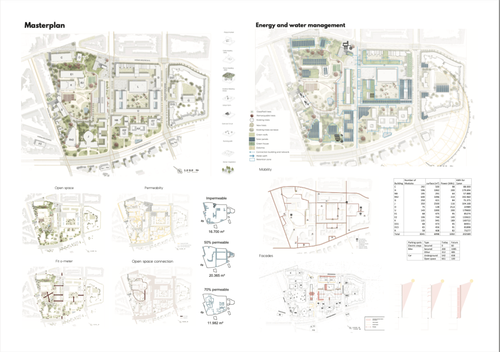 The concept of “Univers-City” highlights five key aspects of the Solbosch campus and its surroundings at the BUD scale: connecting the campus to the city, mobility systems, landscape design, environmental initiatives (including water management and energy), and the broader notion of symbiosis. These strategies not only address sustainability beyond environmental concerns but also consider social and economic factors. By integrating the university with the city of Brussels, the campus will be transformed into an open space for the local community.
